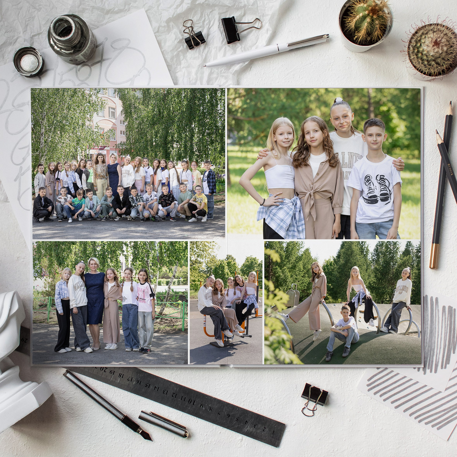 Все фотографии вы выбираете сами. Одна съемка — в школе или любом другом месте на ваш выбор или решаем вместе. Есть возможность заказывать дополнительные развороты, если вам понравилось больше фотографий чем мы можем вместить на два разворота. Если вы хотите больше съемок, чем одна, можно заказать альбомы от 4-х разворотов.